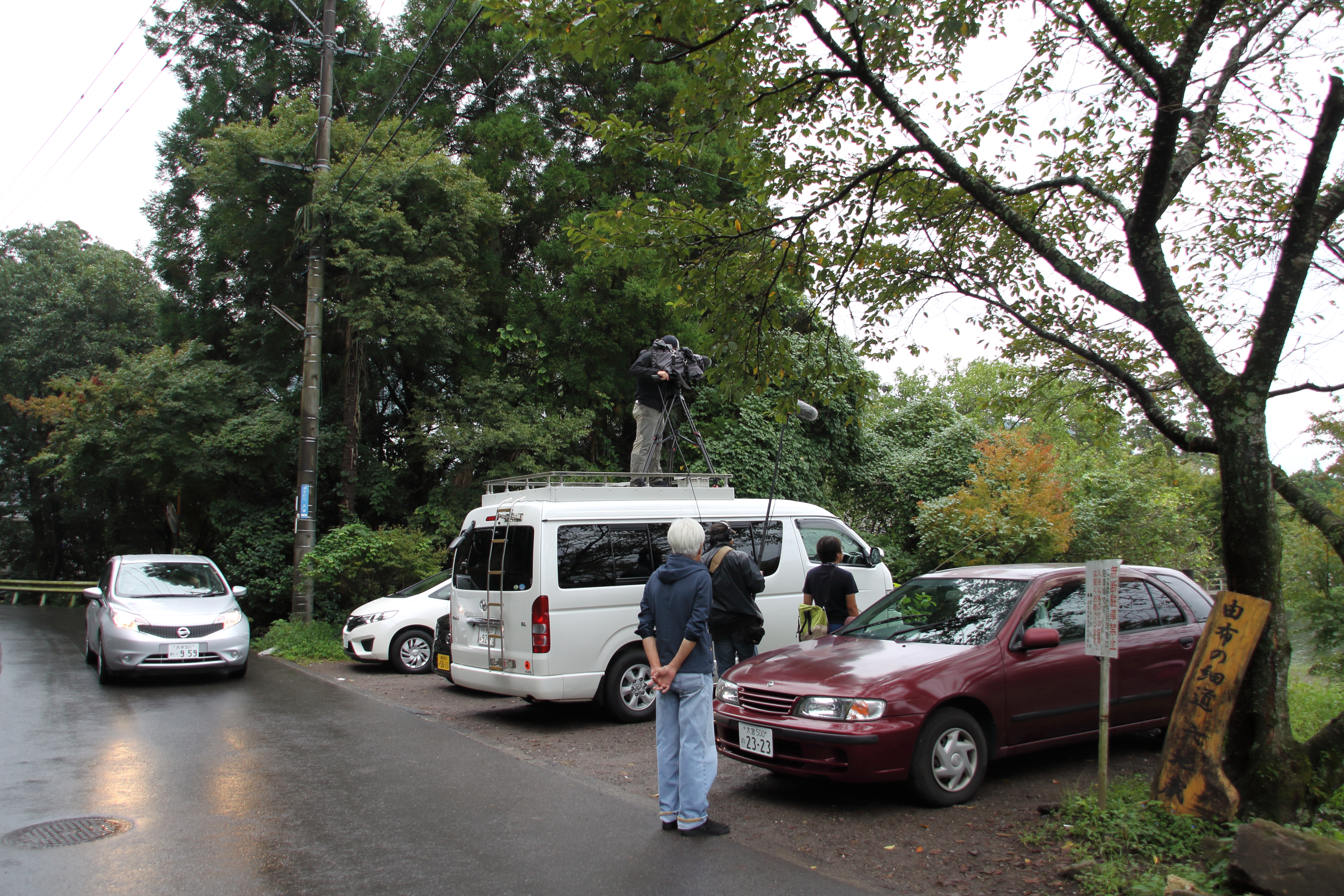 一見すると、TV番組の撮影スタッフに見えますが、本物の下請けプロダクションならば営業車に会社名をデカデカと書きます。 会社名を書いていないのは、知られたくないからですね。 この時も、気づかれないように物陰からwebmasterを撮影していました。