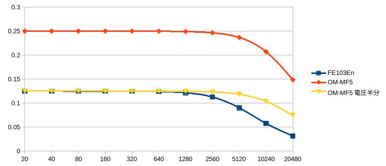もしこれが本当ならば、OM-MF5とFE103Enのそれぞれを電流駆動した場合、インピーダンスの増え方が著しいFE103Enの方がより高域強調されるはずです。 実際に電流駆動してみると、二つとも高域はほぼ同じに聴こえます。 お試しあれ。