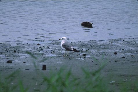ウミネコと頭を水に突っ込んで餌を探すカルガモ。