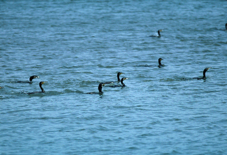 カワウの集団です。 多分、えさを取るために、魚を浅瀬に追い込んでいるところでしょう。